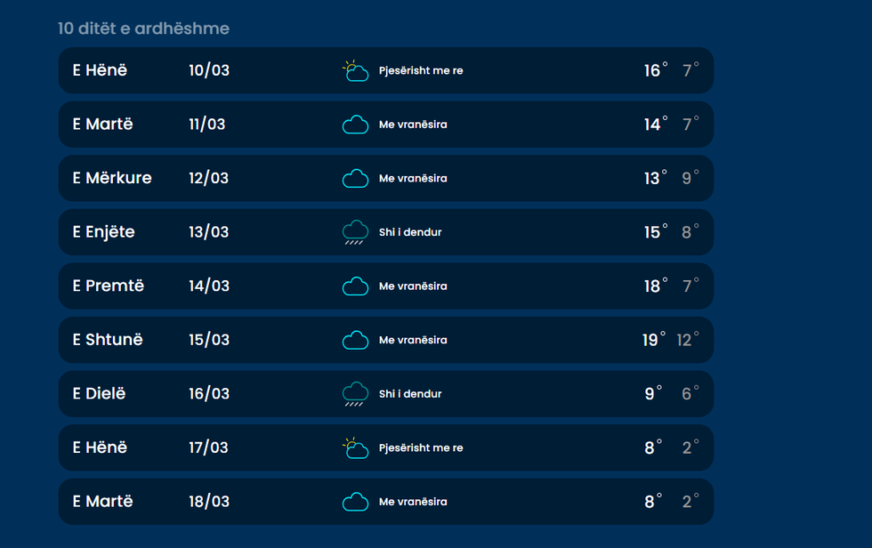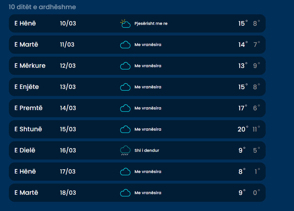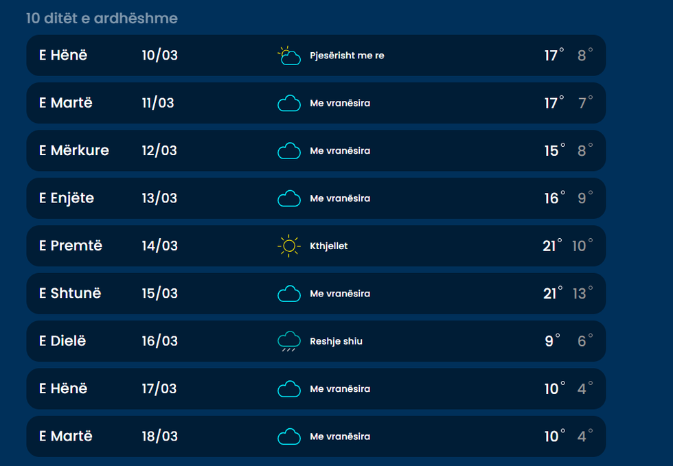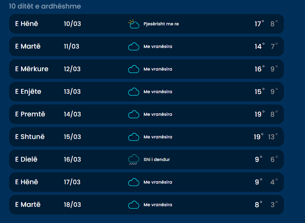 Në Pejë, moti do të jetë kryesisht me vranësira gjatë shumicës së ditëve, ndërsa të enjten dhe të dielën priten reshje shiu. Temperaturat maksimale do të lëvizin nga 16°C deri në 19°C, ndërsa ato minimale do të zbresin deri në 2°C në ditët e fundit të parashikimit.