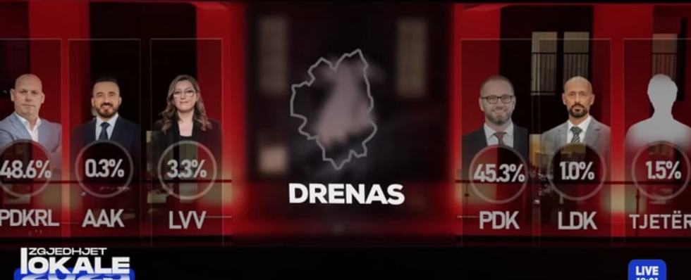 Rezultatet tregojnë një garë të ngushtë në këtë komunë, me mundësi reale që Drenasi të shkojë drejt një balotazhi, nëse asnjëri nga kandidatët nuk arrin shumicën absolute pas numërimit zyrtar të votave.