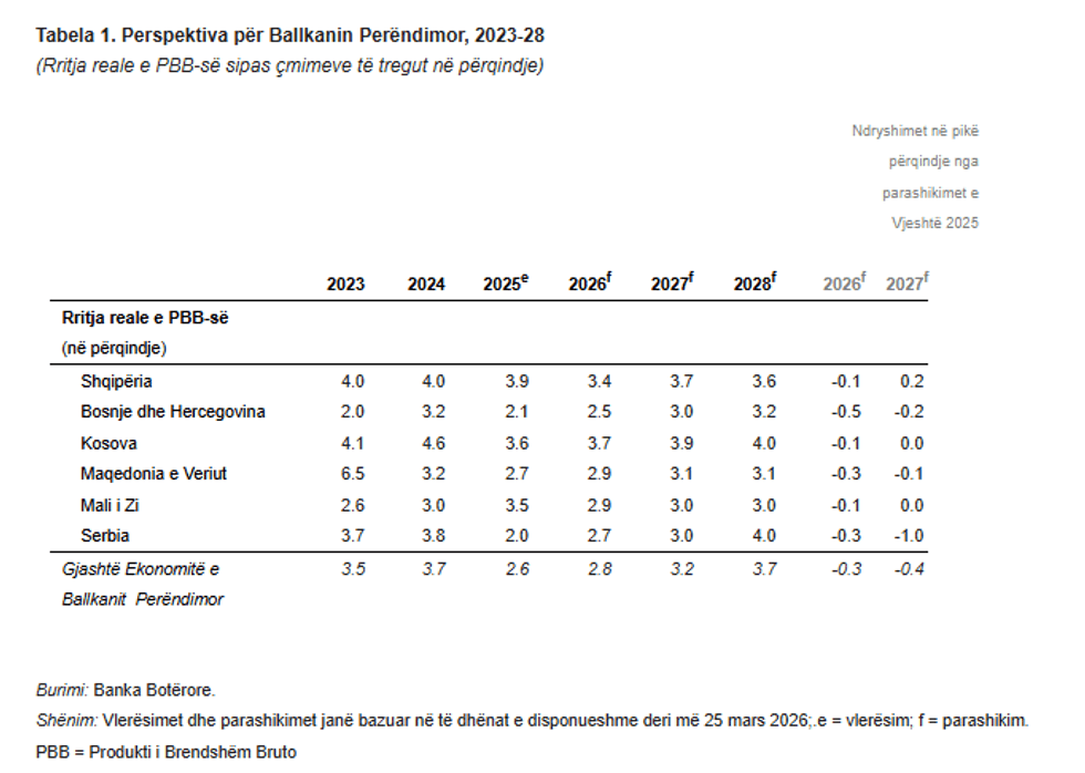 Në raportin më të fundit të Bankës Botërore për Ballkanin Perëndimor, parashikohet se ekonomia e Kosovës do të vazhdojë të ketë rritje të ngadaltë gjatë viteve 2026–2027, në linjë me trendin rajonal dhe ndikimet nga pasiguritë globale.