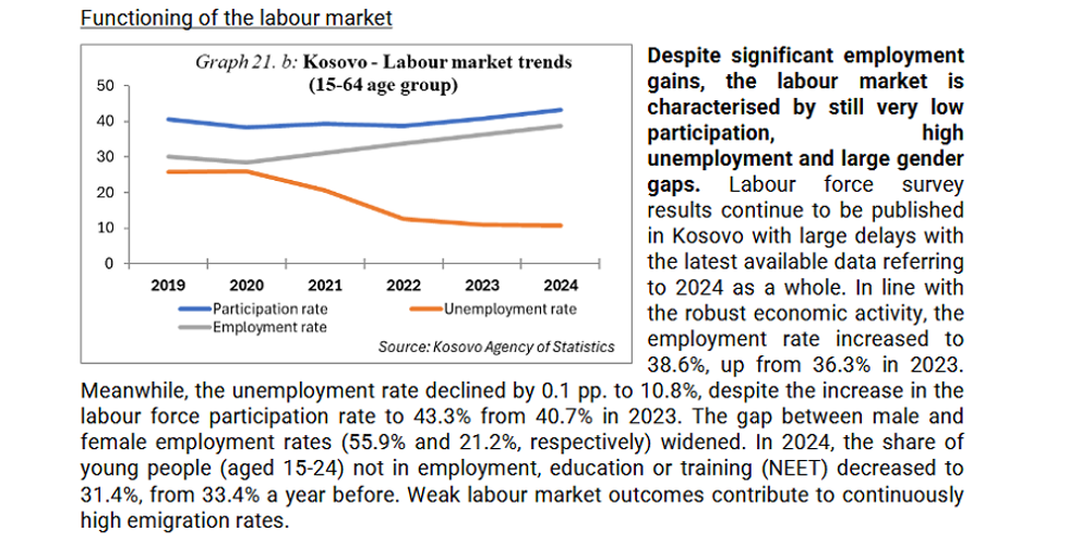 Në raport thuhet se tregu i punës në Kosovë “karakterizohet nga pjesëmarrje ende shumë e ulët, papunësi e lartë dhe boshllëqe të mëdha gjinore”.