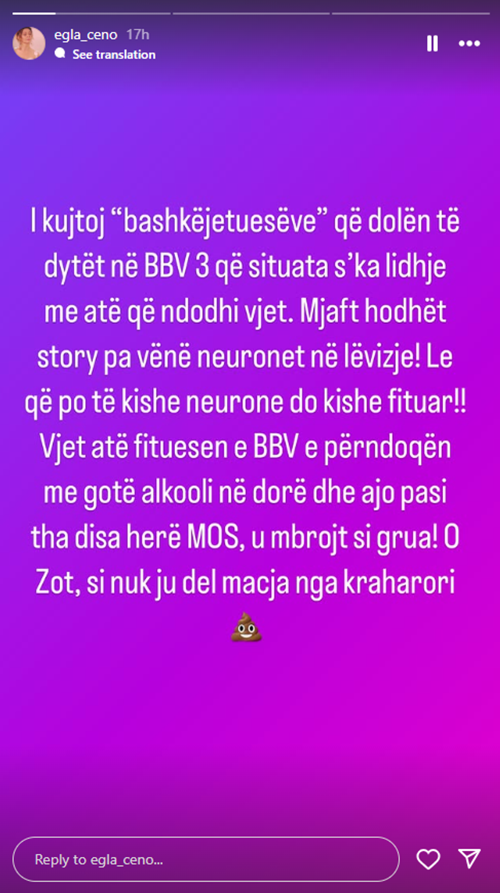 Egla Ceno ka reaguar për ngjarjen e djeshme (e hënë) që ndodhi në Big Brother VIP Albania.