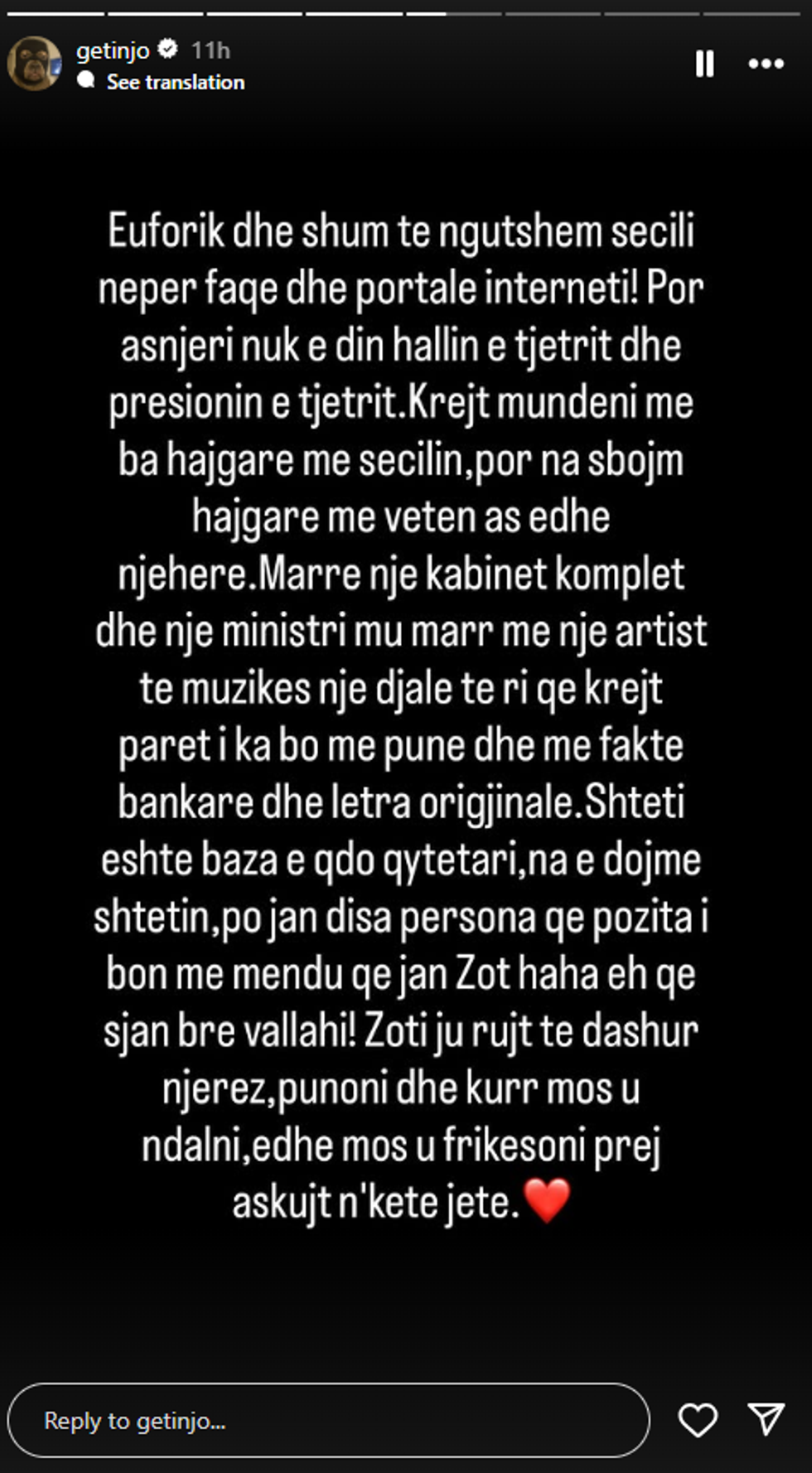 Në këtë reagim, Getinjo gjithashtu dërgon një mesazh të fortë për respekt ndaj shtetit dhe qytetarëve, ndërsa paralajmëron se ndikimet e padrejta dhe presionet personale nuk do të duhet të ndalin askënd në rrugën e suksesit.