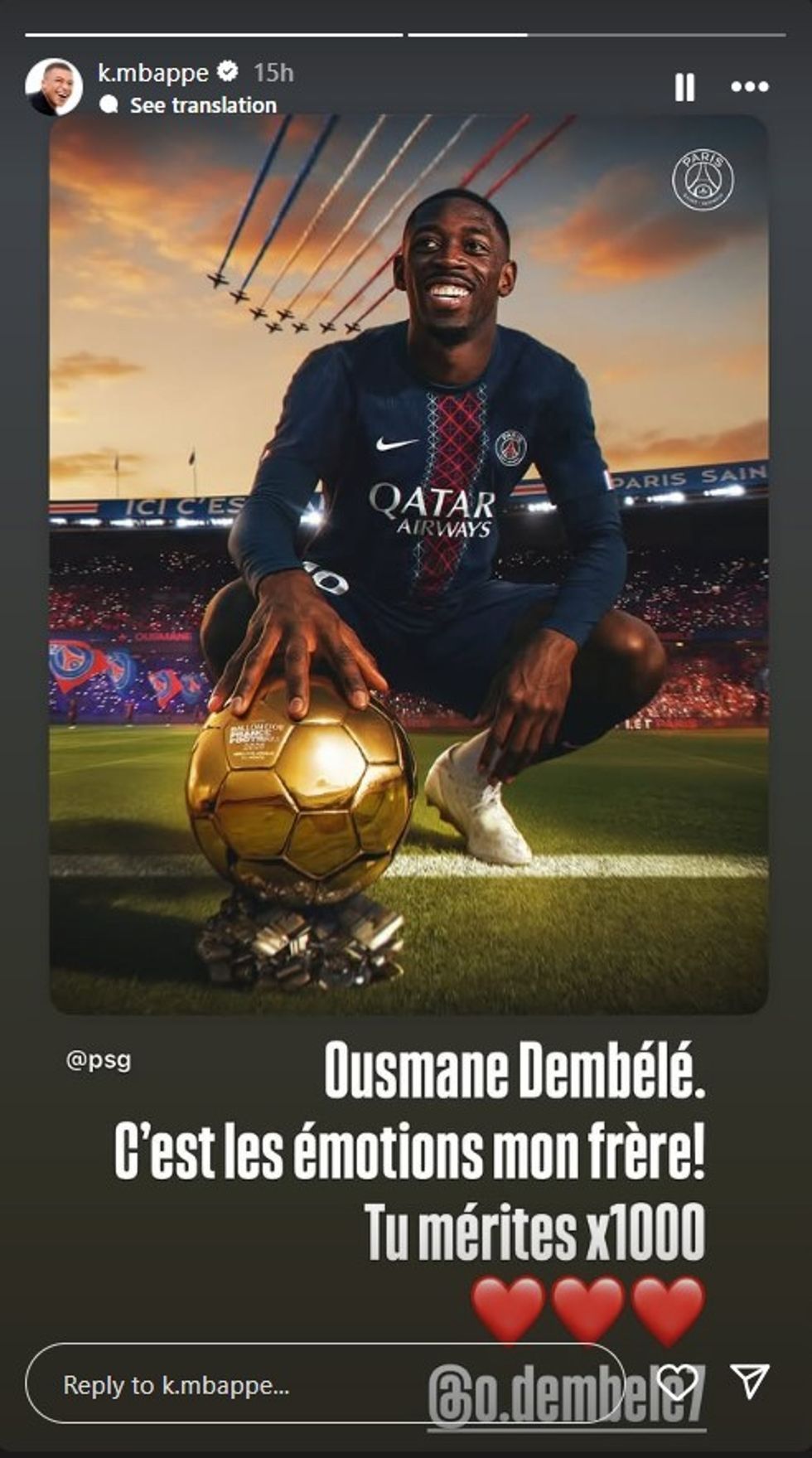 “Ousmane Dembele. Ka të bëjë me emocionet, vëlla. E merituar 100 herë", shkroi ylli francez i Real Madridit në Instagramin e tij.
