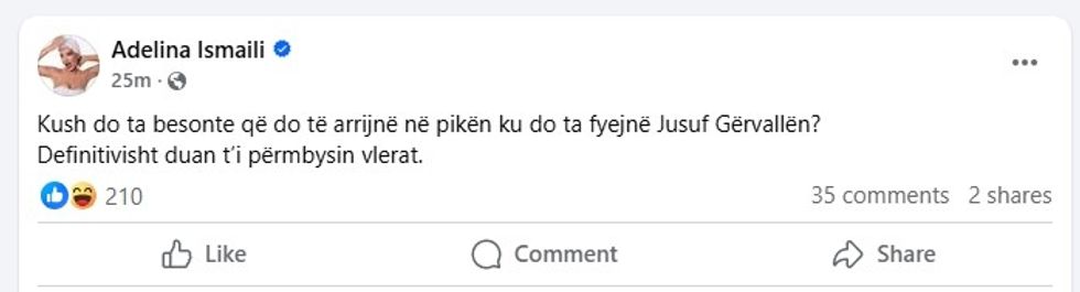 “Kush do ta besonte që do të arrijnë në pikën ku do ta fyejnë Jusuf Gërvallën? Definitivisht duan t’i përmbysin vlerat”, shkroi artistja, duke kujtuar figurën e veprimtarit dhe patriotit të madh, i cili u flijua për çështjen kombëtare.