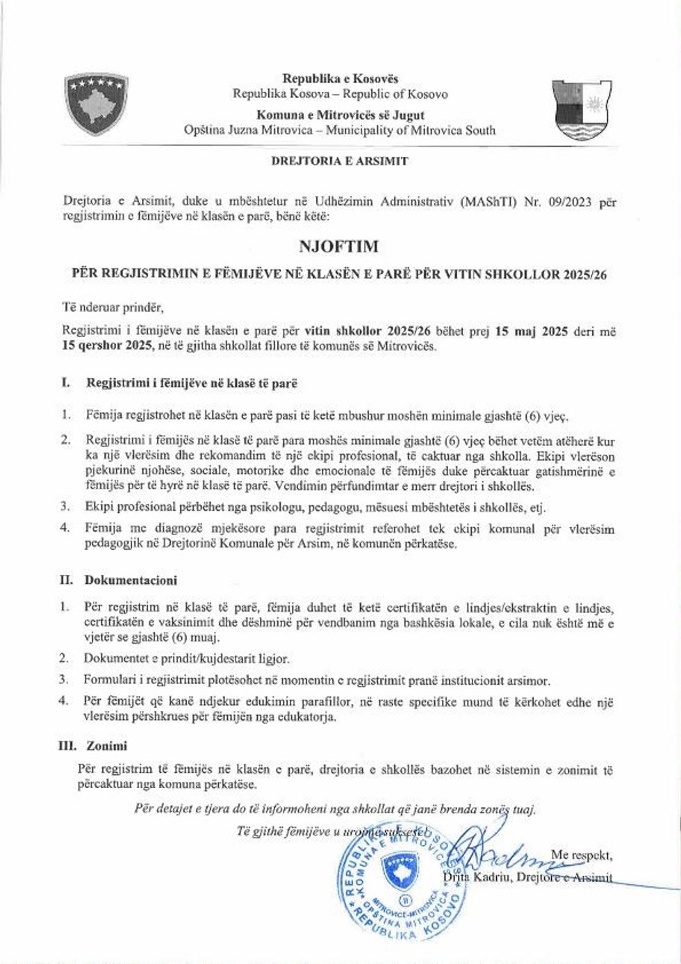 Komuna e Mitrovicës bën të ditur se fëmija regjistrohet në klasën e parë pasi të ketë moshën minimale gjashtë vjeç.
