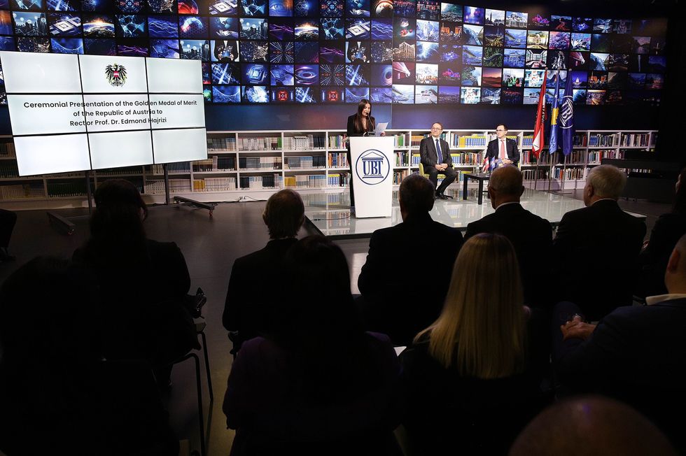 Dekorata e lartë iu dorëzua Rektorit Hajrizi, në një ceremoni solemne organizuar sot në Parkun Inovativ të UBT-së, nga Ambasadori i Austrisë në Kosovë, z. Georg Schnetzer.