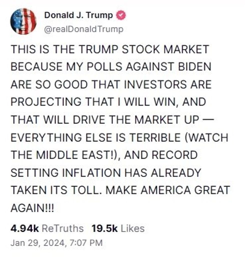 Në mesazhin e parë, më 29 janar 2024, Trump shkruante se "këto janë bursat e Trumpit".