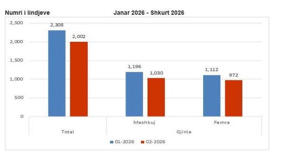 Sipas ASK-së, në muajin shkurt 2026 ka rënie të numrit të lindjeve rreth (13,3%) krahasuar me muajin janar 2026 ku ishin 2 308 lindje. /Telegrafi/