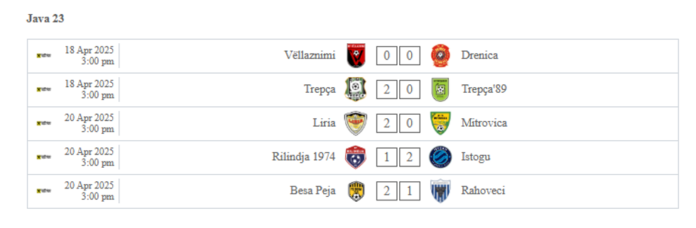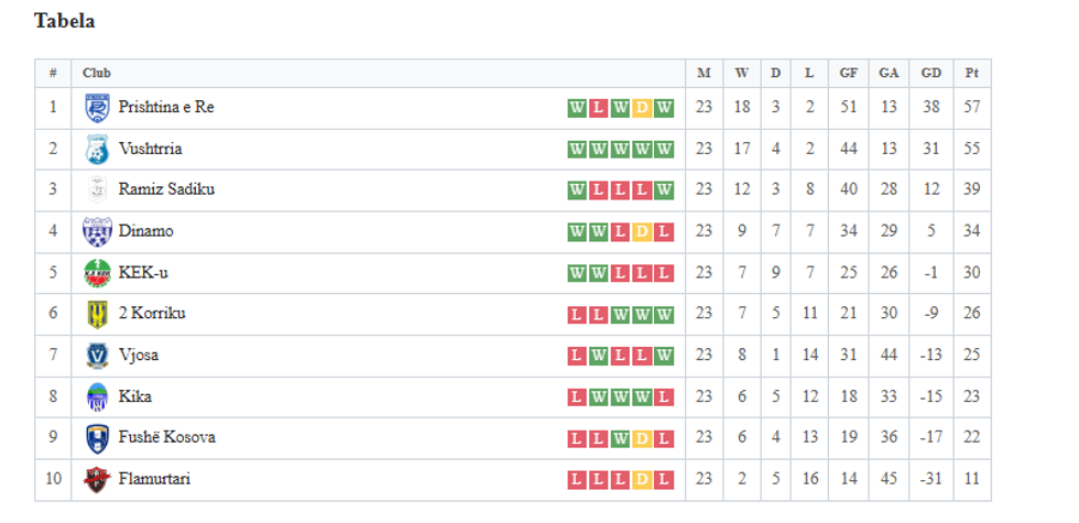 Trepça është e pesta me 38 pikë, kur kanë mbetur edhe katër ndeshje deri në fund. Besa Peja është e gjashta me 28 pikë, ndërsa Rilindja 1974 e shtata me 27 pikë. Istogu është i teti me 24 pikë.