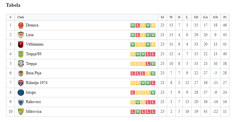 Rahoveci me 16 pikë është i nënti, me pak gjasa për mbijetesë, ndërsa Mitrovica zyrtarisht ka rënë në Ligën e Dytë.