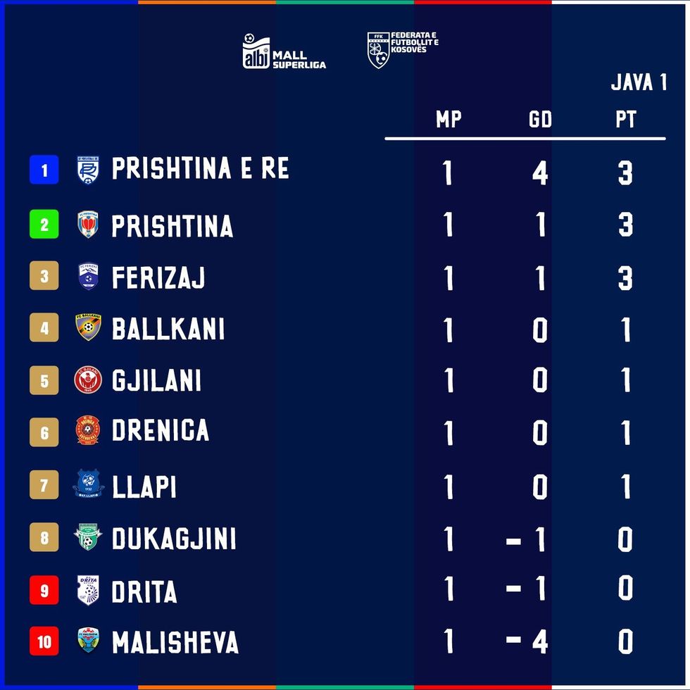 Duke parë renditjen, surpriza e madhe është në krye: Prishtina e Re udhëheq Superligën me golavarazh më të mirë (+4), e ndjekur nga Prishtina dhe Ferizaj, që gjithashtu kanë nga tre pikë.