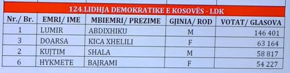 Në listën e deputetëve të zgjedhur nga LDK-ja kryeson Lumir Abdixhiku me 146,401 vota, pason Doarsa Kica-Xhelili me 63,164 vota dhe Kujtim Shala me 58,817 vota.