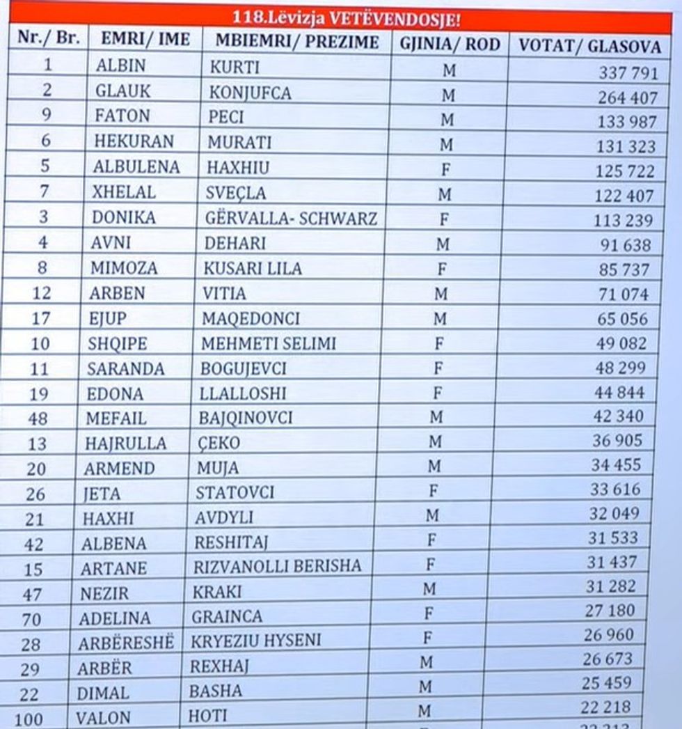 Nga rezultatet e kandidatëve, që do të jenë deputetë të ardhshëm të Kuvendit të Kosovës, njeriu më i votuar në Kosovë është Albin Kurti me 337,791 vota.