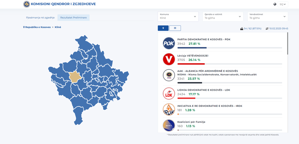 Ndërkaq, në Komunën e Klinës deri më tash janë numëruar 87.10 për qind e votave, në të cilat me vota prin Partia Demokratike e Kosovës me gjithsej 27.81 për qind e votave, më pas vjen LVV-ja me 26.14 për qind, AAK-Nisma ka marrë 23.57 për qind dhe LDK-ja 17.17 për qind të votave.
