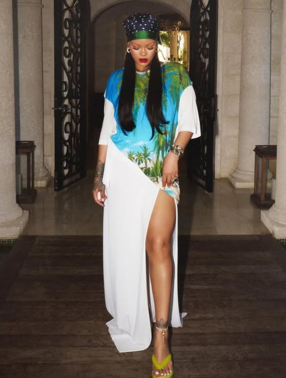 Në fotografi, Rihanna prezanton edhe sandalet e reja të dizajnuara nga ajo dhe Puma, me çmim 75 funte (afërsisht 88 euro), të disponueshme në ngjyrë limoni dhe portokalli, si dhe një çantë të përshtatshme për 70 funte (82 euro).