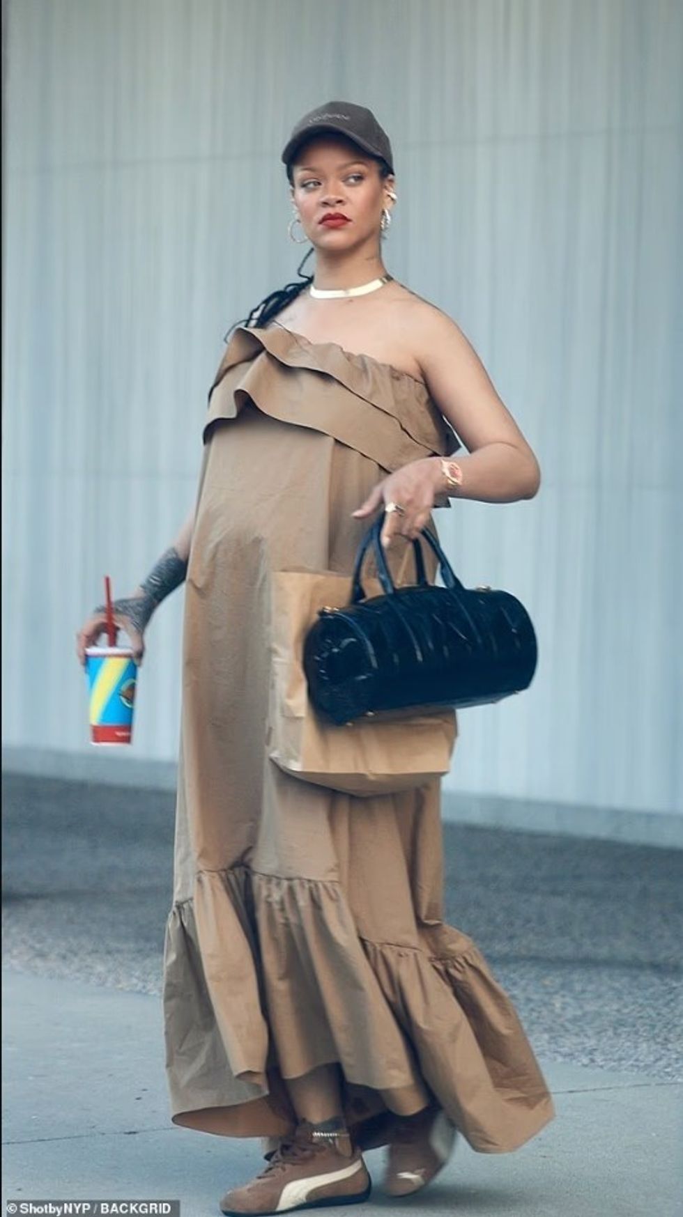 E veshur me një fustan të lehtë veror me rrudha ngjyrë kafe të çelët, një kapele bejsbolli dhe atlete Puma, Rihanna dukej krejtësisht e relaksuar dhe njëkohësisht elegante, shkruan DailyMail.