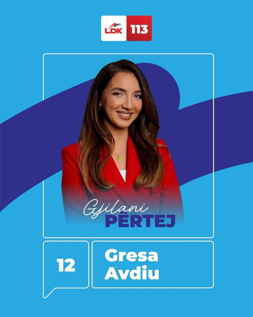 Gresa Avdiu rikandidon nga radhët e Lidhjes Demokratike të Kosovës (LDK), me numrin 12 në fletëvotim.