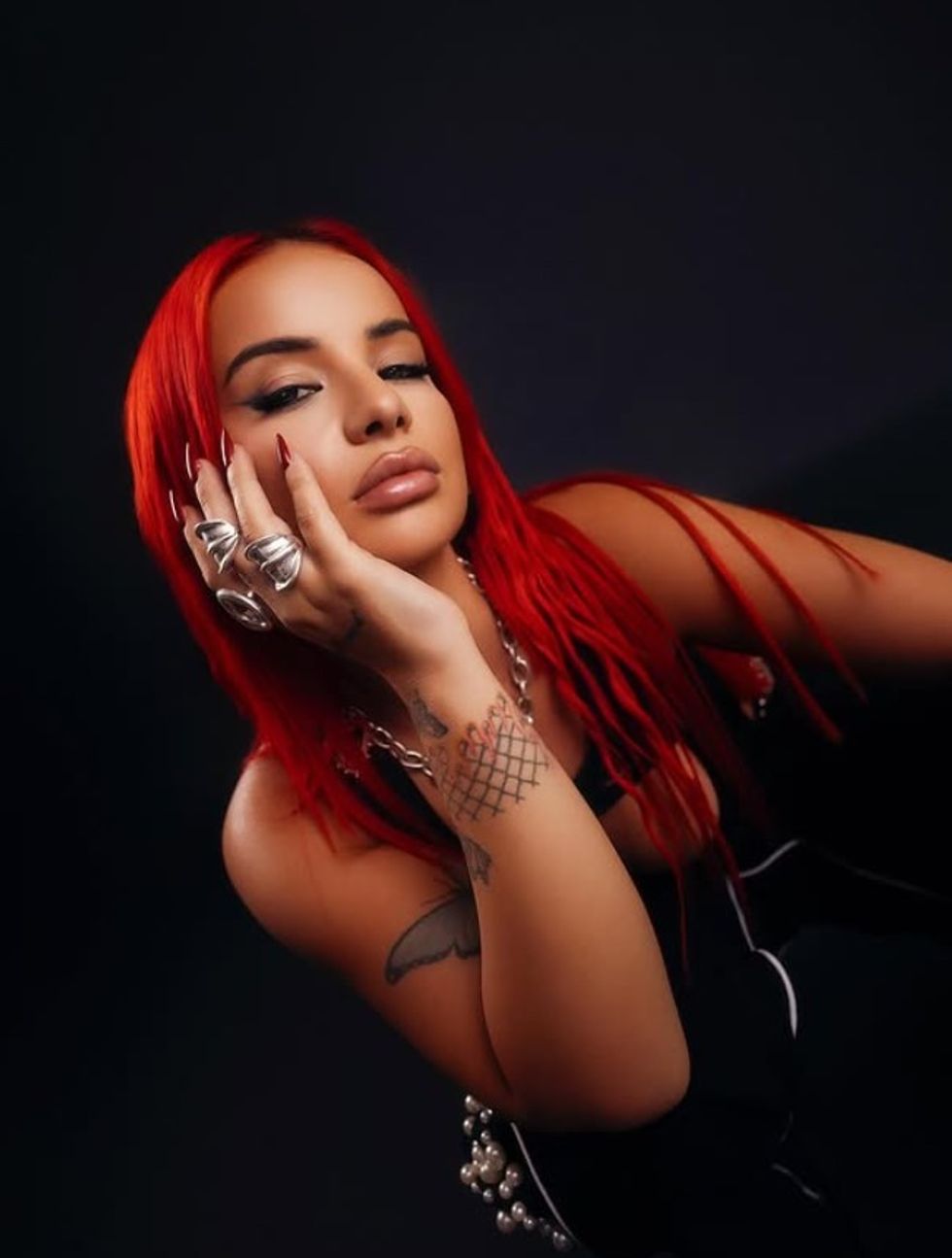 Këngëtarja u paraqit me flokë të kuqe të ndezura dhe një veshje të zezë me prerje provokuese, që i thekson linjat trupore dhe stilin e saj karakteristik.