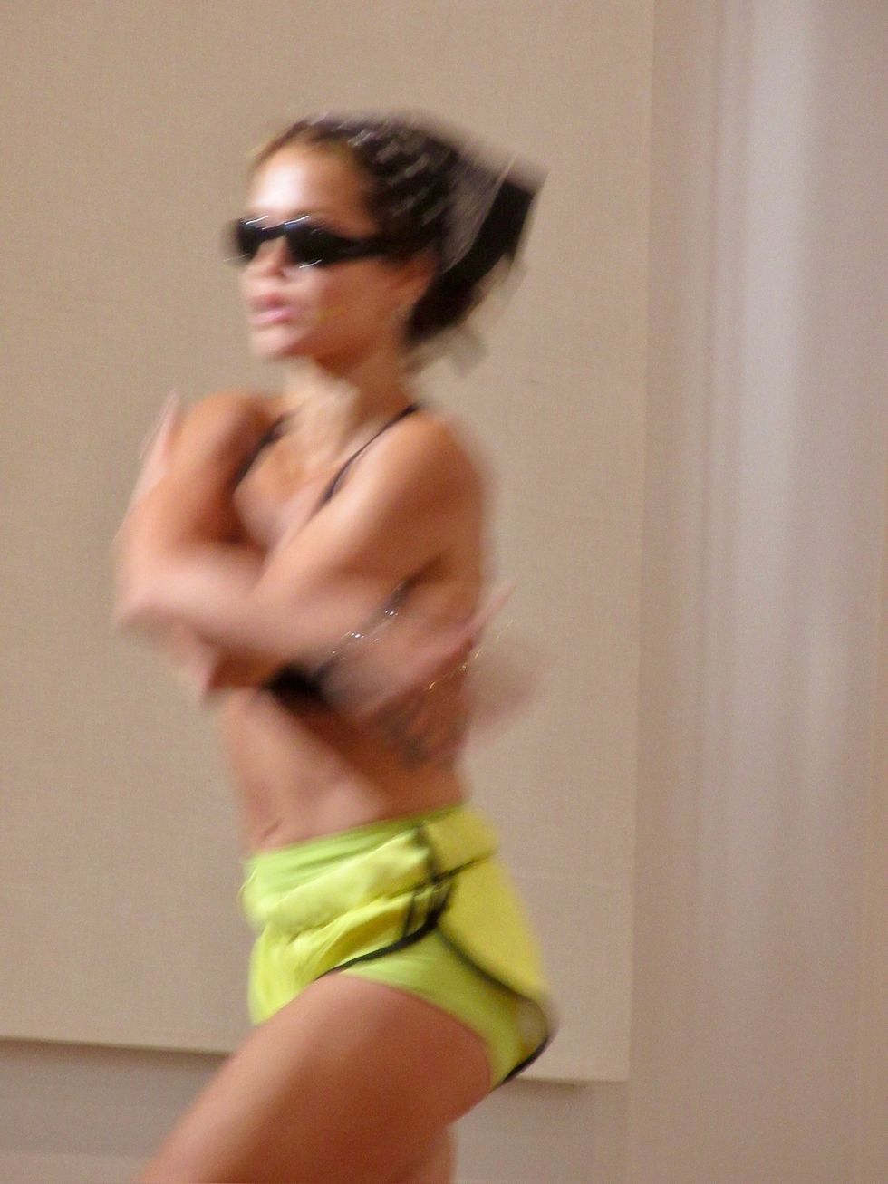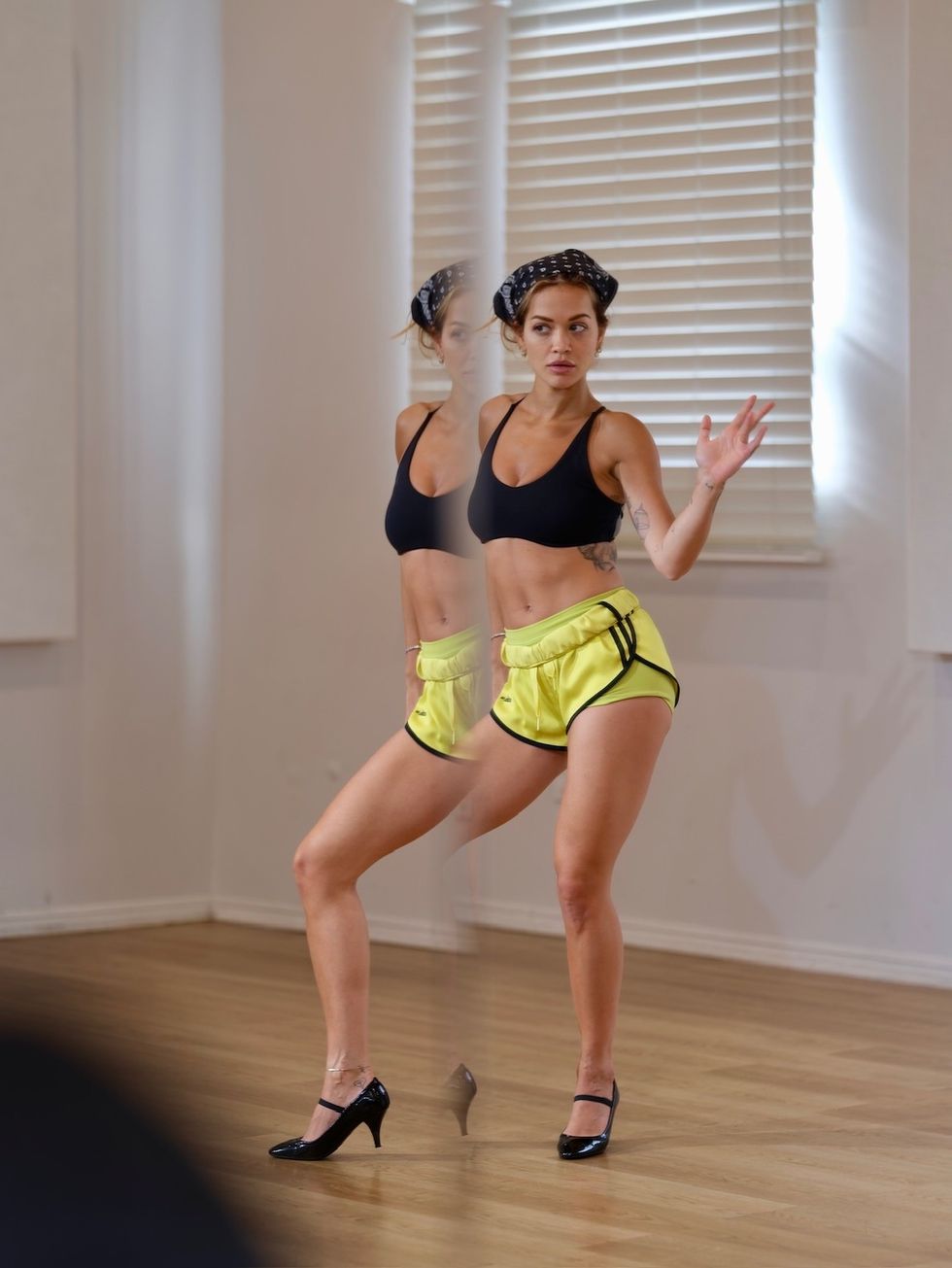 Në imazhet e postuara, Rita shfaqet në një ambient të brendshëm - me një veshje sportive që përfshin një top të zi sportiv, pantallona të shkurtra neon dhe takë elegante të zeza.
