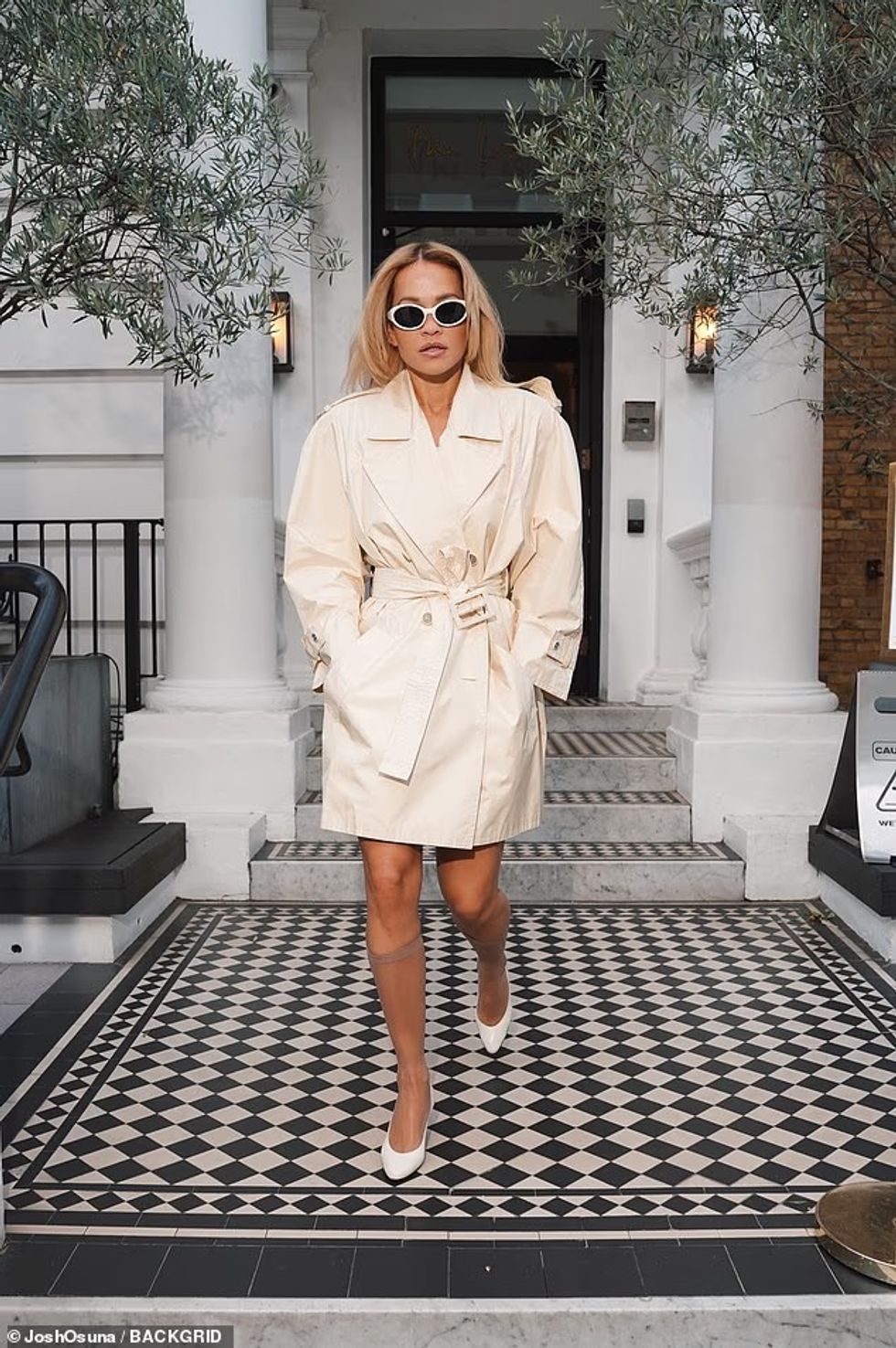 Duke ekspozuar këmbët e saj të gjata, Rita shtoi centimetra shtesë me një palë taka të bardha të mprehta, duke e kombinuar këtë pamje chic me çorape të ngjyrës nude.