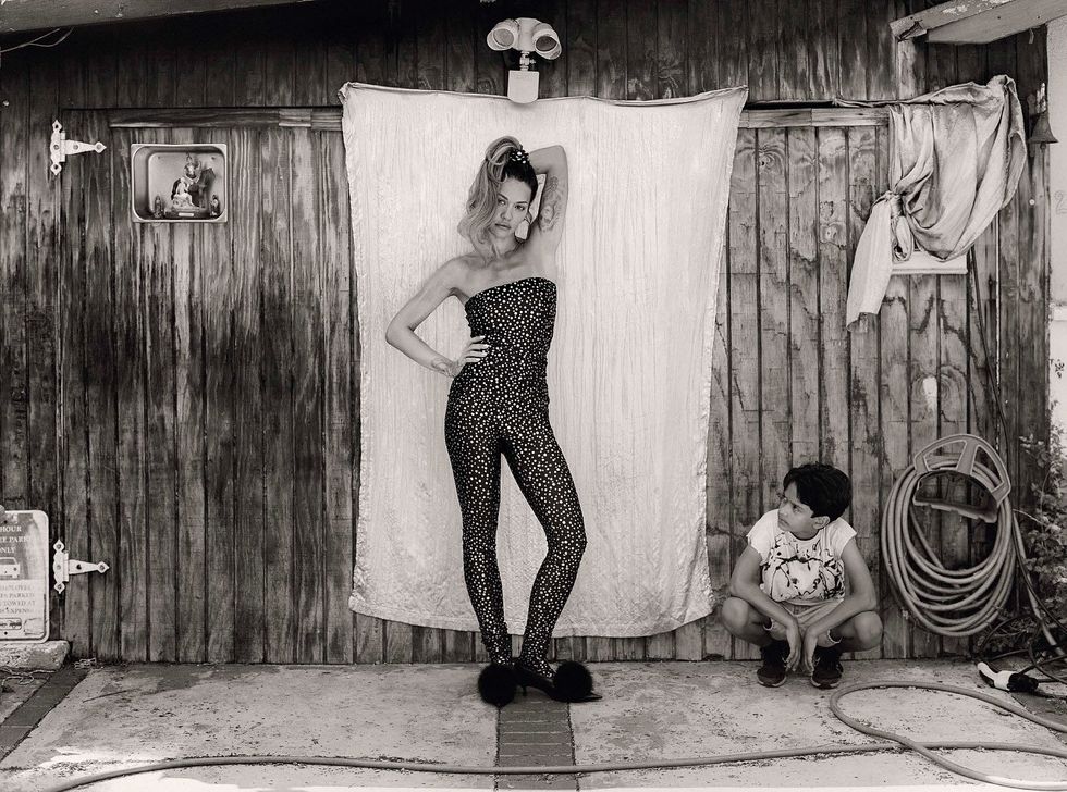 Me flokë të mbledhura në mënyrë të çrregullt, buzë të theksuara dhe një qëndrim plot vetëbesim, ajo përcjell një ndjenjë fuqie dhe lirie personale.