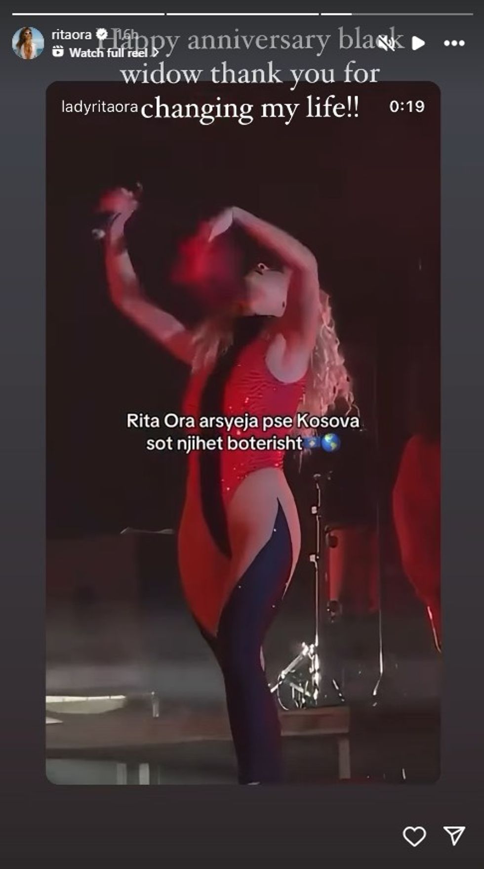 Në InstaStory, Rita ka rishpërndarë një video të publikuar fillimisht nga një faqe fansash, ku ajo shihet duke kënduar “Black Widow” në sheshin “Nënë Tereza” në Prishtinë, ndërsa vallëzon me valle tradicionale shqiptare – vallen e Rugovës. E veshur me flamurin shqiptar dhe e shoqëruar nga balerinë që interpretonin motive kombëtare, kjo performancë u kthye në një nga momentet më të paharrueshme të koncertit historik.