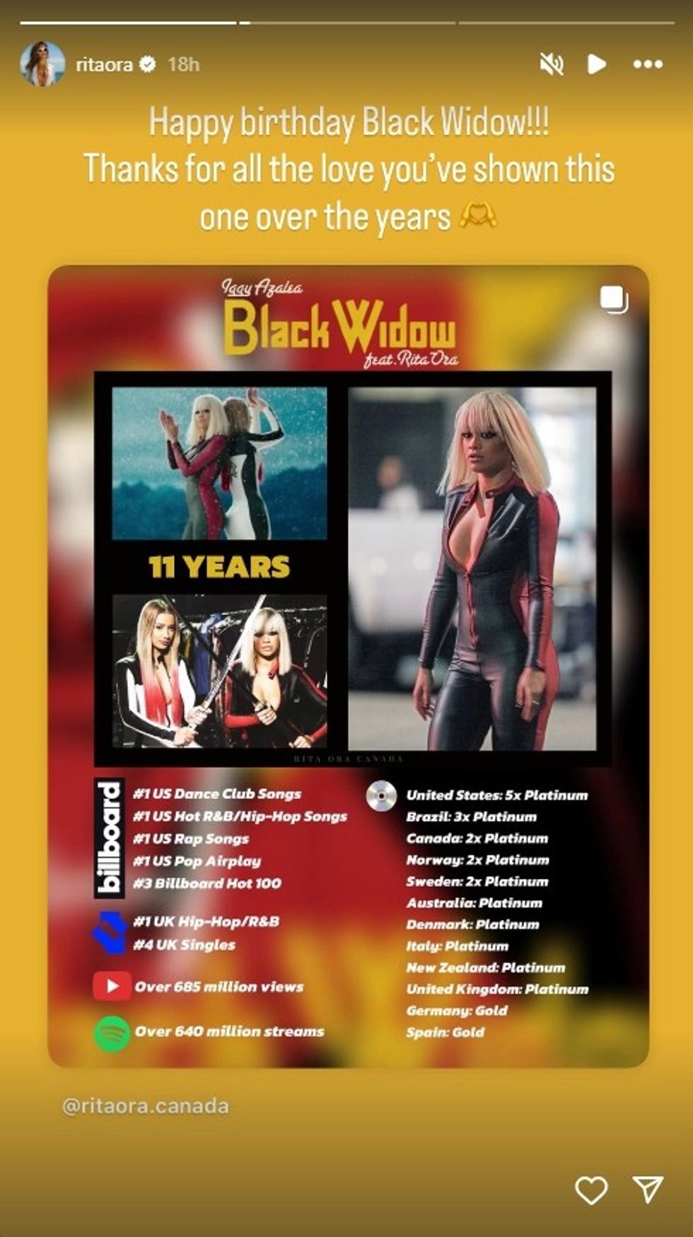 Në postimin e saj, Rita ka shkruar: “Urime përvjetorin Black Widow, faleminderit që ndryshove jetën time”.