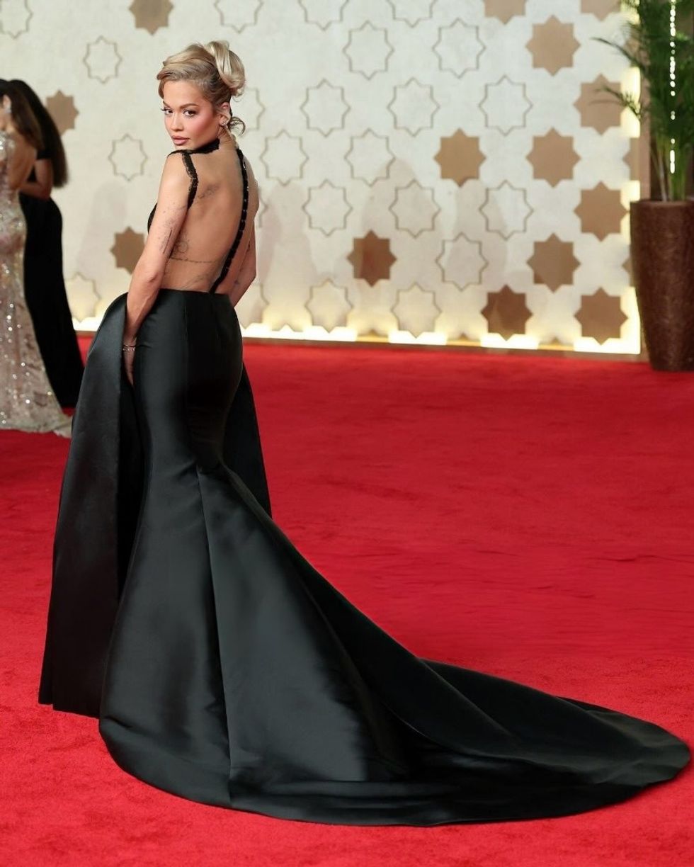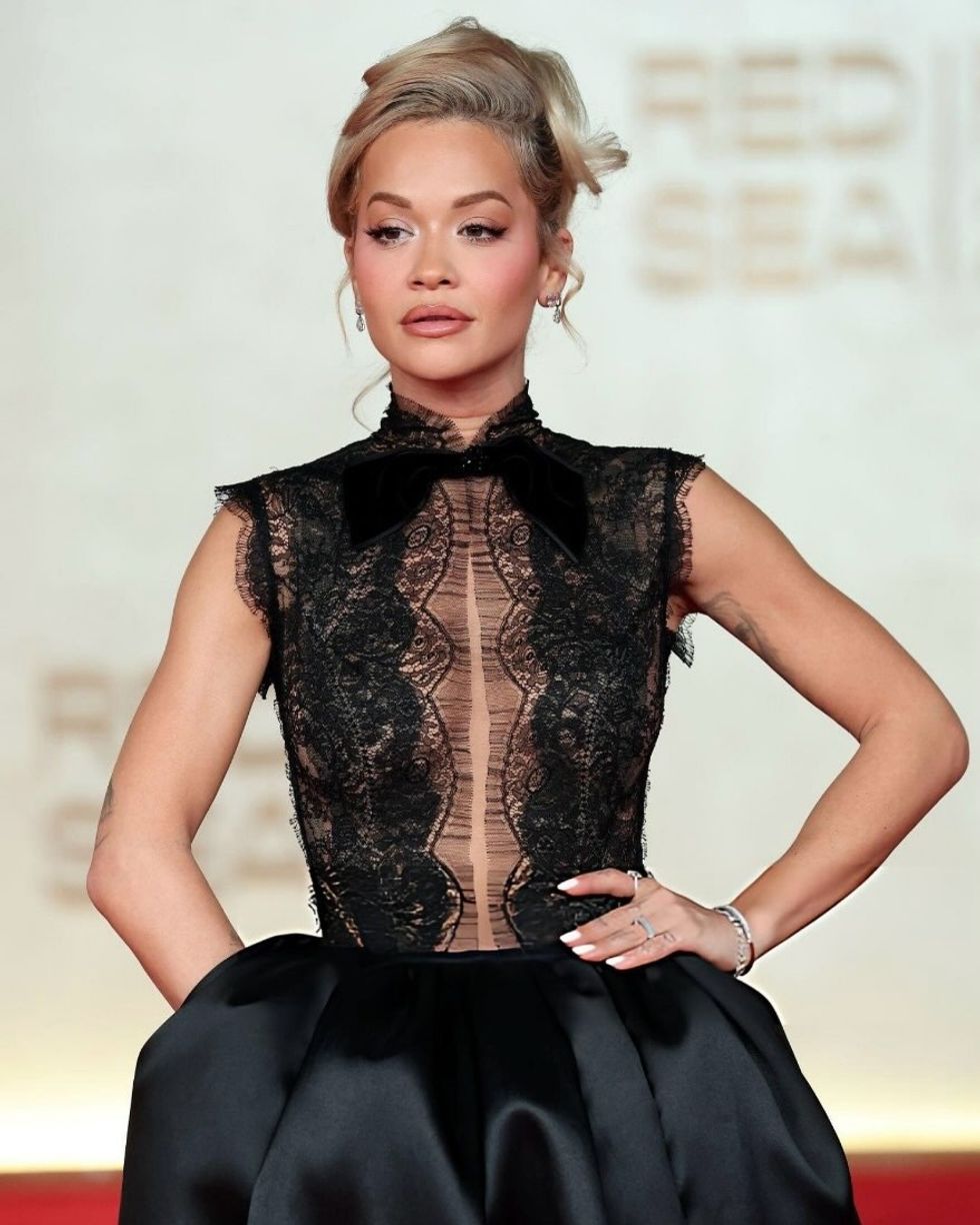 Rita Ora tërhoqi vëmendjen me një fustan të zi elegant, me prerje të guximshme, dhe flokët e kapura lart, duke i dhënë një prekje klasike dhe të sofistikuar paraqitjes së saj.