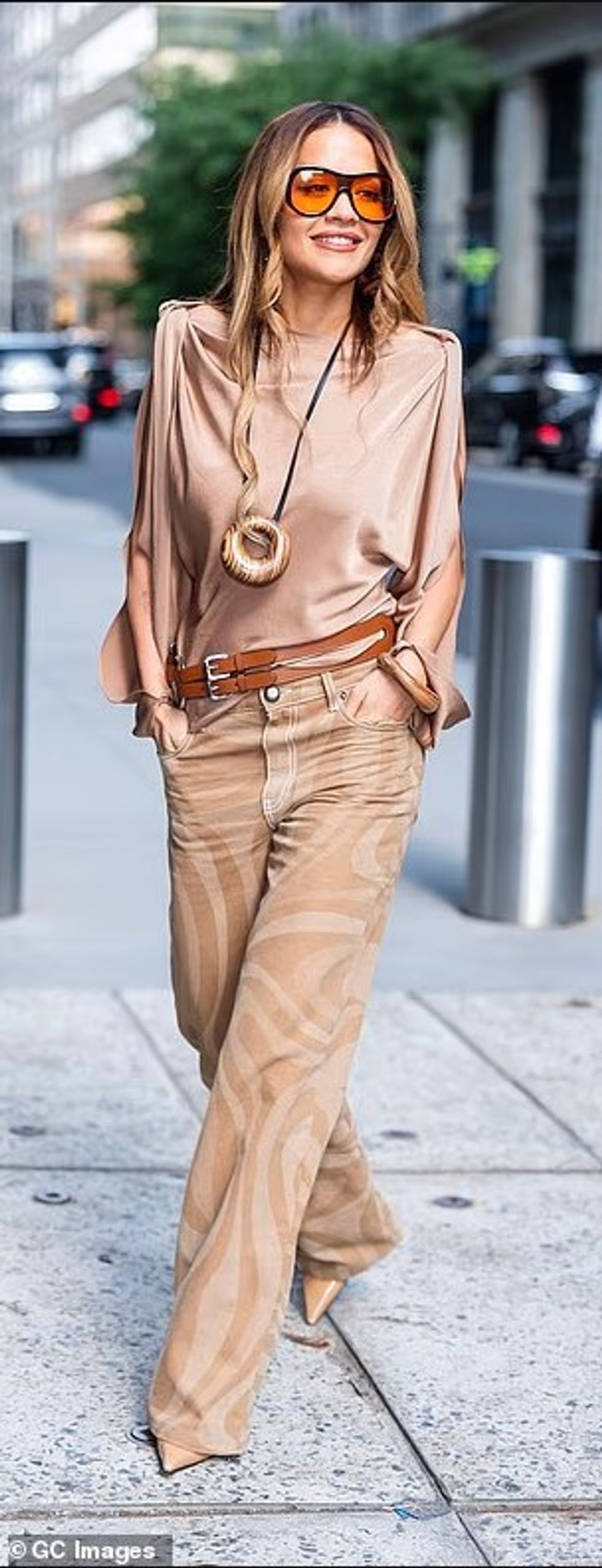 Të dielën, Rita kombinoi një shall 400 paundësh (afërsisht 470 euro) me një fund të ngushtë dhe çizme kaubojsh, ndërsa më herët kishte veshur xhinse rozë Pucci me vlerë 750 paund (afërsisht 880 euro) dhe bluzë të varur.