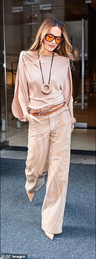 Të dielën, Rita kombinoi një shall 400 paundësh (afërsisht 470 euro) me një fund të ngushtë dhe çizme kaubojsh, ndërsa më herët kishte veshur xhinse rozë Pucci me vlerë 750 paund (afërsisht 880 euro) dhe bluzë të varur.