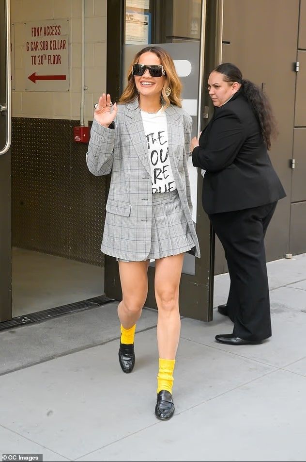 Të hënën u shfaq me fund të shkurtër gri, çorape të verdha dhe bluzën me mbishkrimin “The Rumors Are True”.