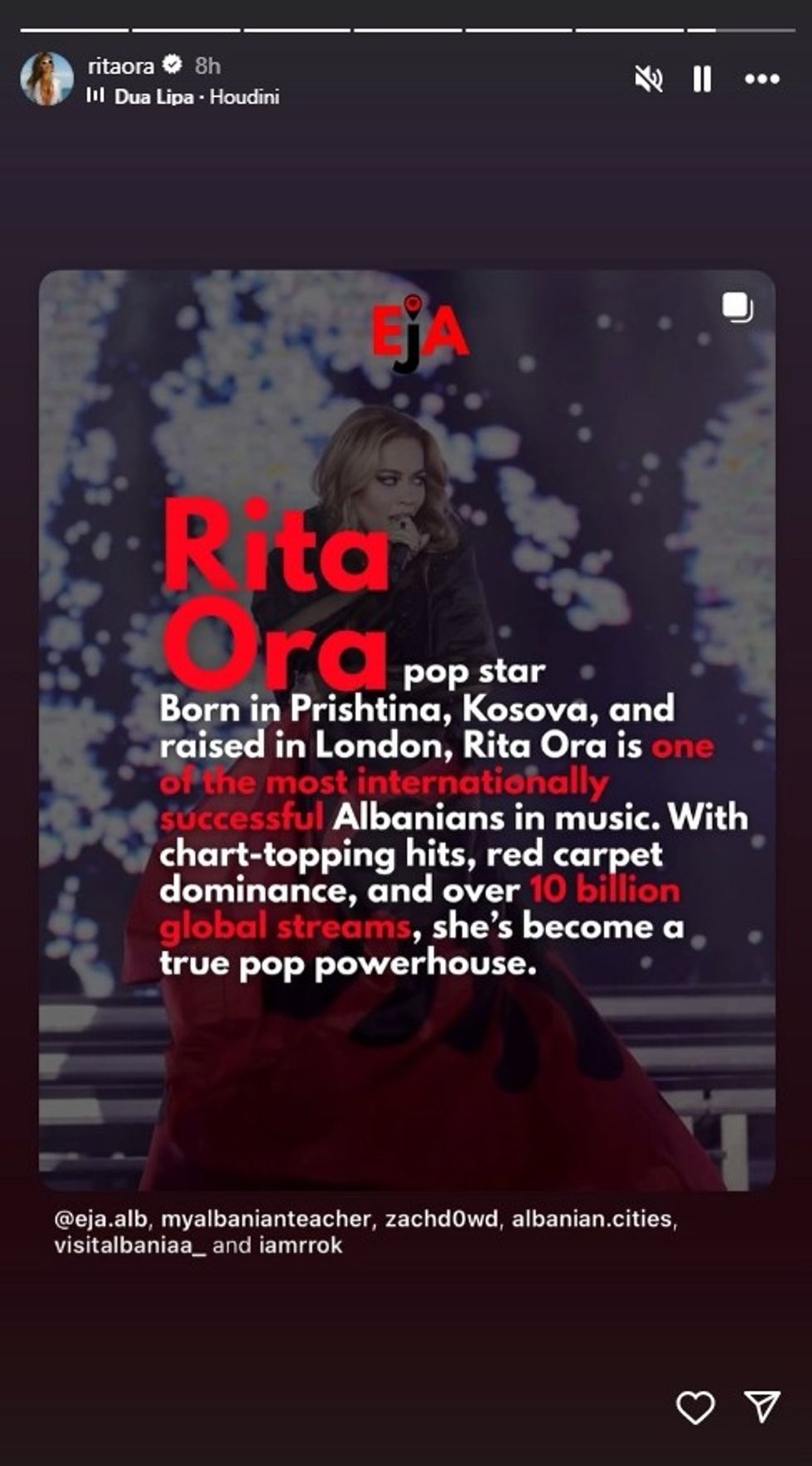 Këngëtarja shqiptare me famë botërore, Rita Ora, së fundmi ka rishpërndarë në InstaStory një postim nga faqja Eja, i cili i kushtohej shqiptarëve më të suksesshëm në arenën ndërkombëtare.