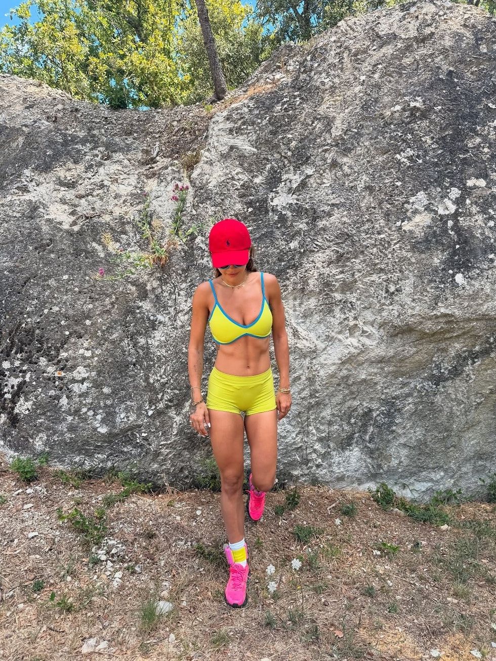 Në një tjetër moment, ajo shihet e veshur me veshje sportive në nuanca neon, pranë një shkëmbi natyror, ku trupi i saj i tonifikuar tregon përkushtimin ndaj fitnesit dhe një stil jetese të shëndetshëm. Me një kapele të kuqe dhe atlete rozë, Rita nuk harron të ruajë stilin edhe gjatë aktiviteteve të saj të përditshme.