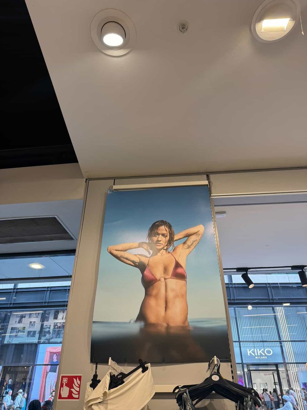 Ndërkohë, një tjetër foto interesante është ajo e një posteri gjigand të saj në një dyqan rrobash banje, ku Rita Ora shihet në një bikini rozë në një imazh që dominohet nga uji dhe drita natyrale – një dëshmi e pranisë së saj globale në industrinë e modës dhe reklamës.