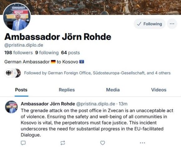 Ambasadori gjerman në Kosovë, Jorn Rohde, e ka quajtur akt dhune të papranueshëm sulmin në Postën e Kosovës në Zveçan.