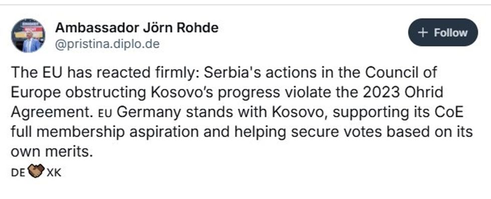 “Më lejoni ta bëj të qartë: Gjermania ka qenë një mbështetëse e fortë e anëtarësimit të plotë të Kosovës në Këshillin e Europës. Dhe Kosova e di saktësisht në cilat pika duhet të dorëzojë në mënyrë që të sigurojë votat e nevojshme. Duke ditur se nuk u siguruan vota të mjaftueshme, ishte opsioni më i mirë për të hequr votën nga rendi i ditës për të parandaluar një humbje në votim që do të kishte qenë një fatkeqësi diplomatike”, ka reaguar Rohde në rrjete sociale.