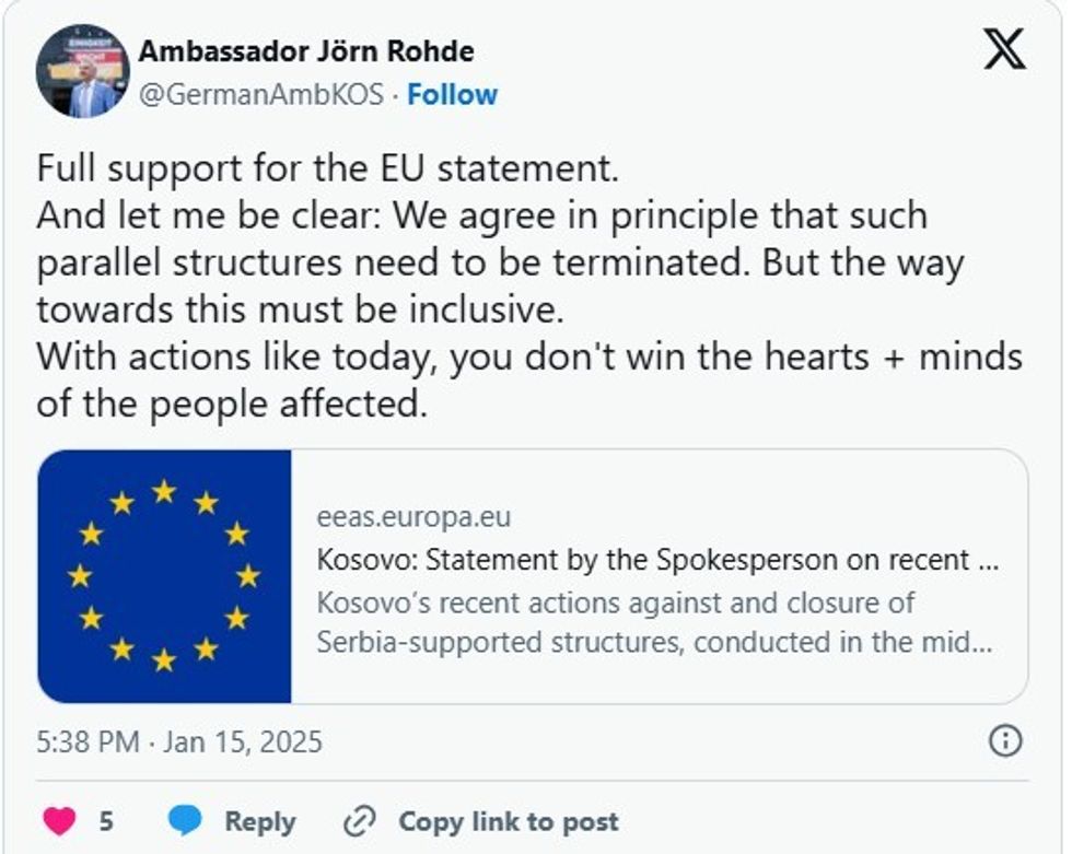 Ambasadori gjerman në Kosovë, Jorn Rohde, i cili shpërndau komunikatën e BE-së në platformën “X”, duke shtuar se pajtohet plotësisht me reagimin e saj ndaj vendimit të autoriteteve kosovare.
