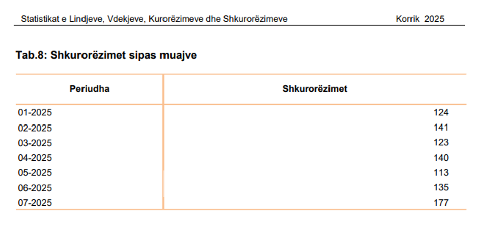 Të dhënat tregojnë se numri më i lartë i shkurorëzimeve është regjistruar në muajin korrik, me 177 raste, ndjekur nga shkurti me 141 raste dhe prilli 140 raste.
