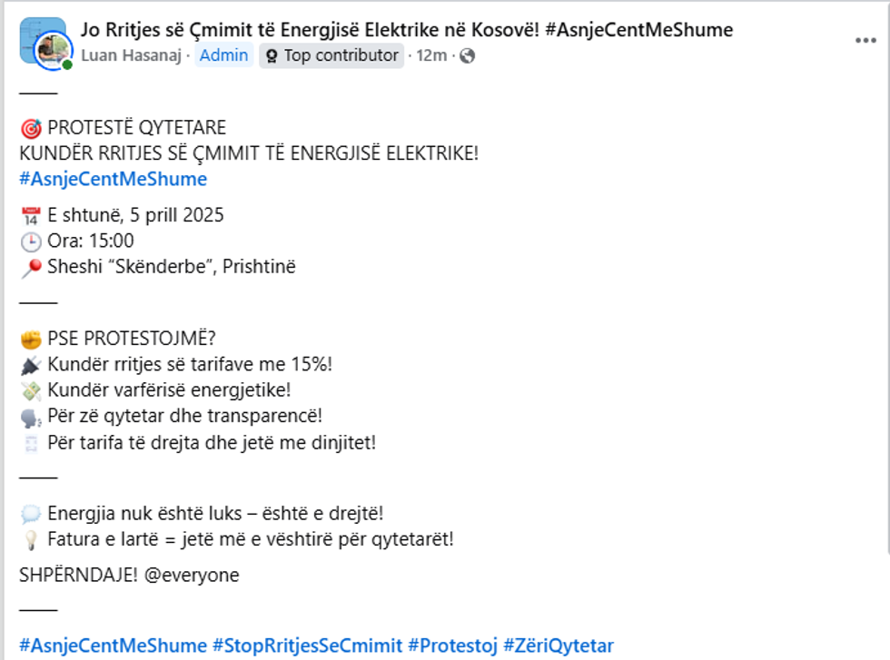 Në njoftimin e shpërndarë për protestën, theksohet se fatura e lartë e energjisë është një barrë e rëndë për familjet kosovare, duke përkeqësuar më tej jetesën e përditshme të tyre. /Telegrafi/