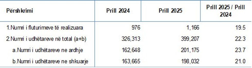 Sipas të dhënave zyrtare, gjatë prillit 2025 janë realizuar 1,166 fluturime, krahasuar me 976 fluturime në prill 2024 – që përbën një rritje prej 19.5%.