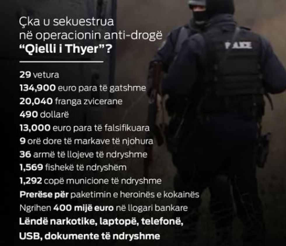 Përveç të arrestuarve, policia gjatë operacionit sekuestroi: 29 vetura; 134,900 euro para të gatshme; 20,040 franga zvicerane; 490 dollarë; 13,000 euro para të falsifikuara; 9 orë dore luksoze; 36 armë të llojeve të ndryshme; 1,569 fishekë dhe 1,292 copë municion; një prese për paketim heroine dhe kokaine; laptopë, telefona, USB dhe dokumente.