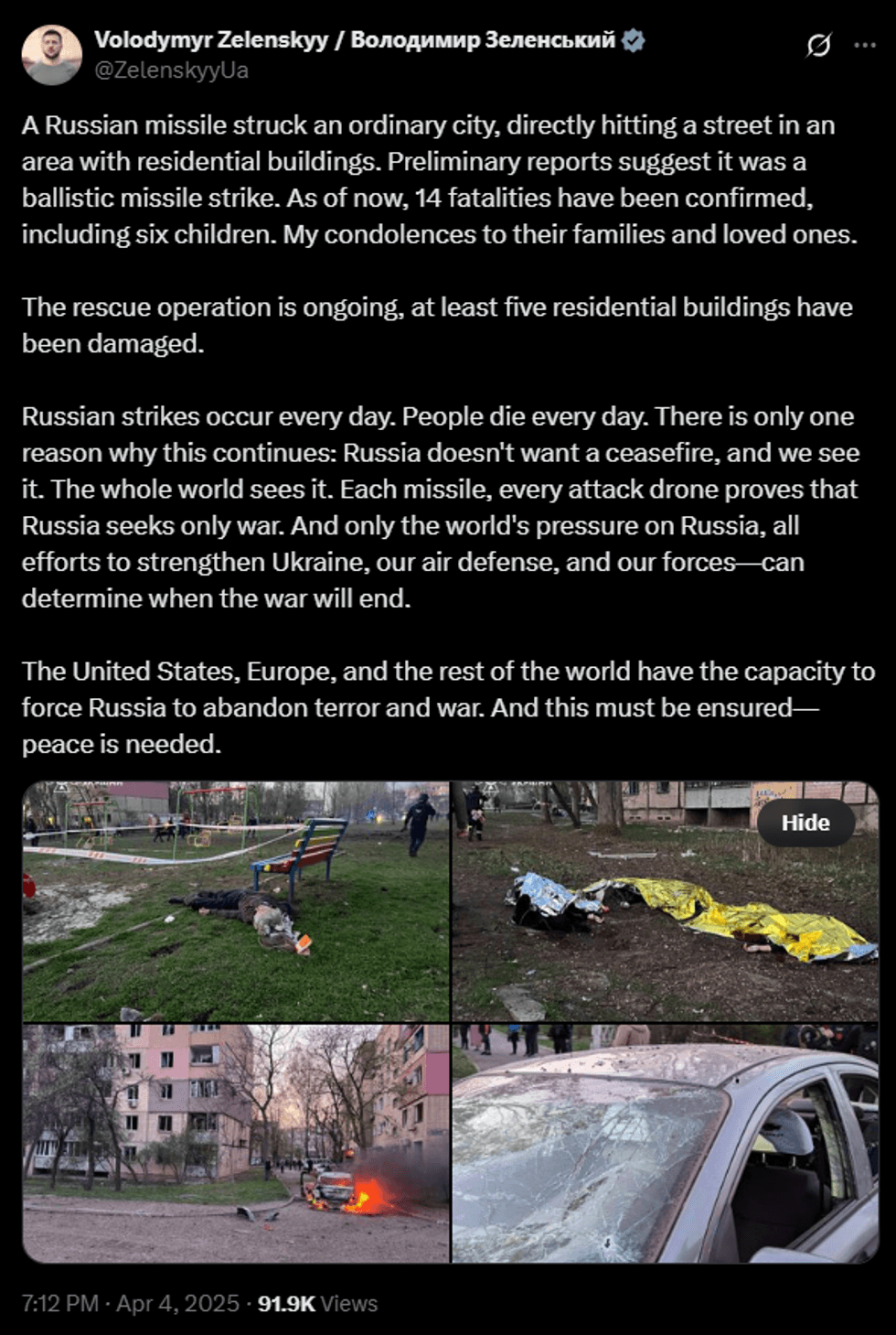 “Një raketë ruse goditi një qytet të zakonshëm, duke goditur drejtpërdrejt një rrugë në një zonë me ndërtesa banimi. Raportet paraprake sugjerojnë se ishte një sulm me raketa balistike. Deri më tani, janë konfirmuar 14 viktima, duke përfshirë gjashtë fëmijë. Ngushëllimet e mia për familjet dhe të dashurit e tyre”, shkroi Zelensky.