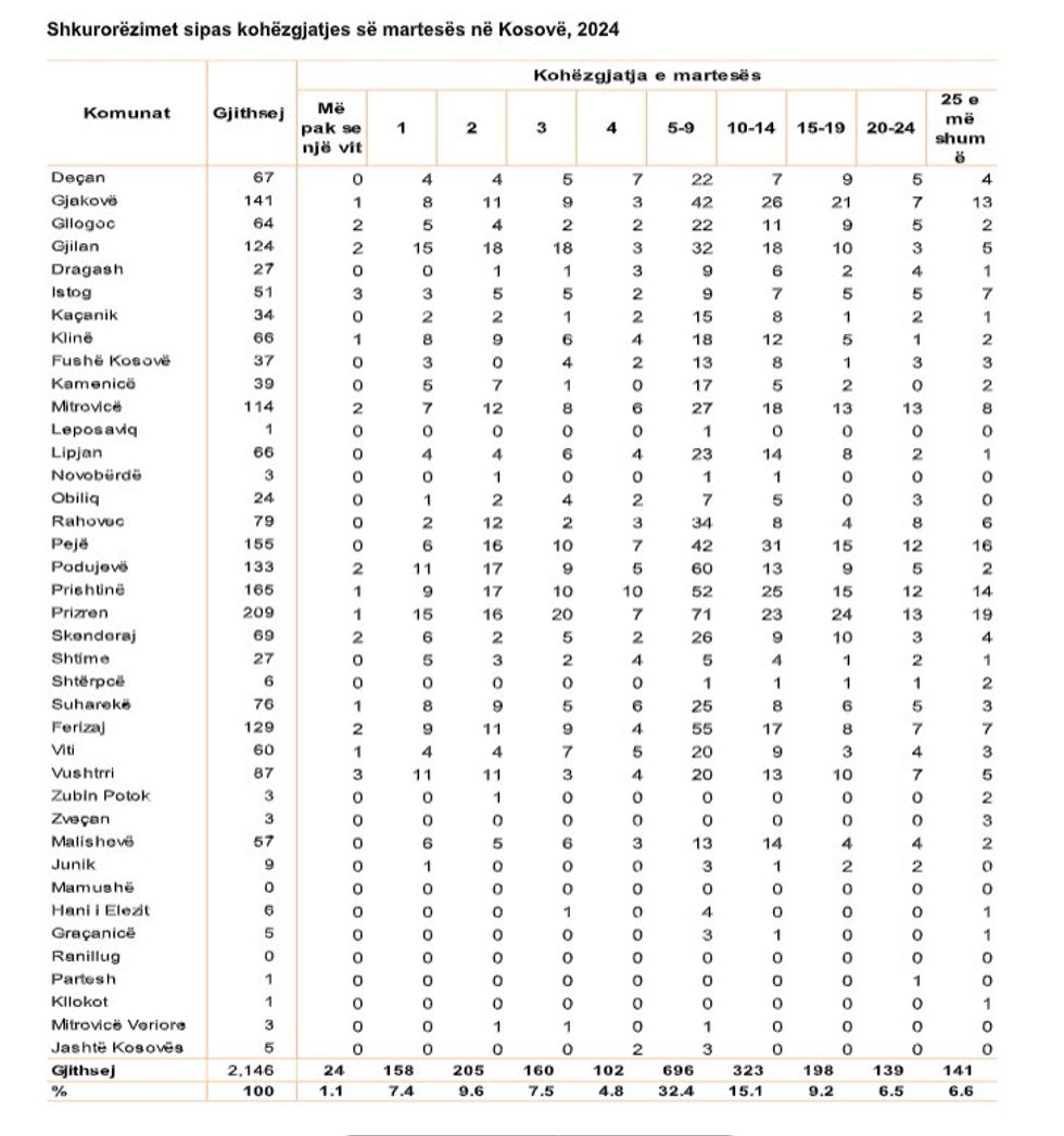 ASK bën të ditur se në vitin 2024, janë regjistruar 2.146 shkurorëzime dhe numri më i madh i shkurorëzimeve, sipas komunave, ishte në Prizren 209 raste të shkurorëzuarve ose 9,7%; Prishtinë 165 raste ose 7,7% dhe Pejë 155 raste ose 7,2% etj.