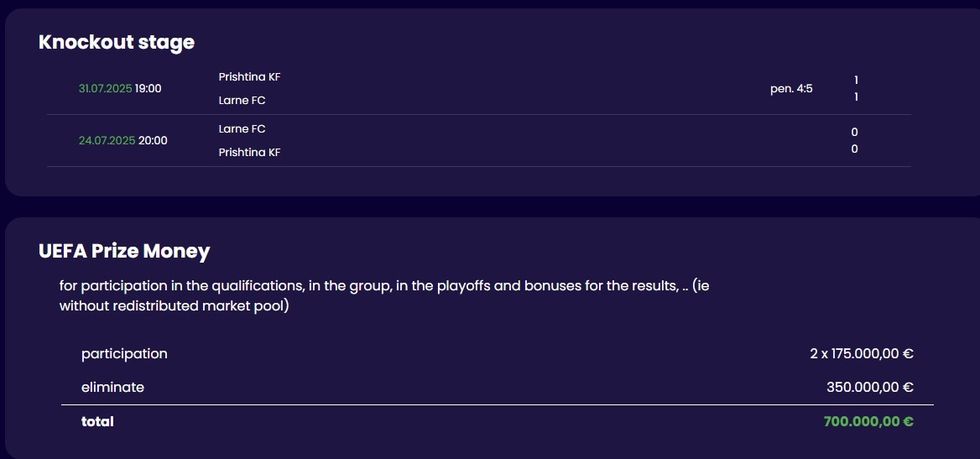 Për pjesëmarrjen e tyre në garat evropiane, Prishtina ka arkëtuar 700 mijë euro, por një kualifikim i mundshëm në rrethin e tretë, do t’i kishte ngritur fitimet e tyre në 1 milionë e 75 mijë euro.