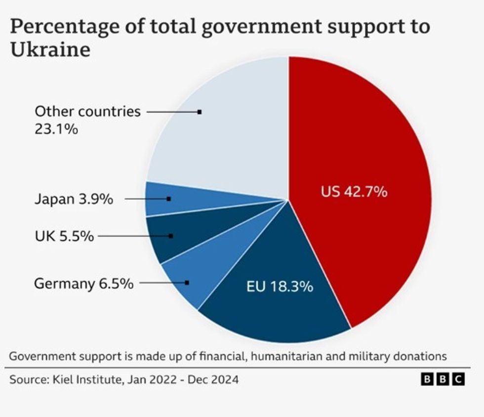 Shtetet e Bashkuara përbëjnë gati 43 për qind të të gjithë ndihmës së alokuar për Ukrainën që nga pushtimi i plotë i Rusisë në vitin 2022, sipas Institutit të Kielit për Ekonominë Botërore, të Jashtme.