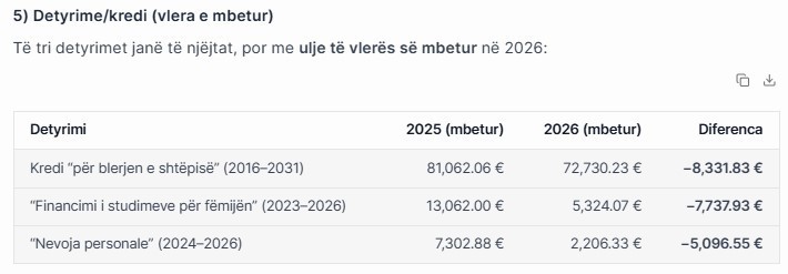 Ulen detyrimet/kreditë e mbetura: renovim −2,201.01 €, kredi banese −1,798.96 €.