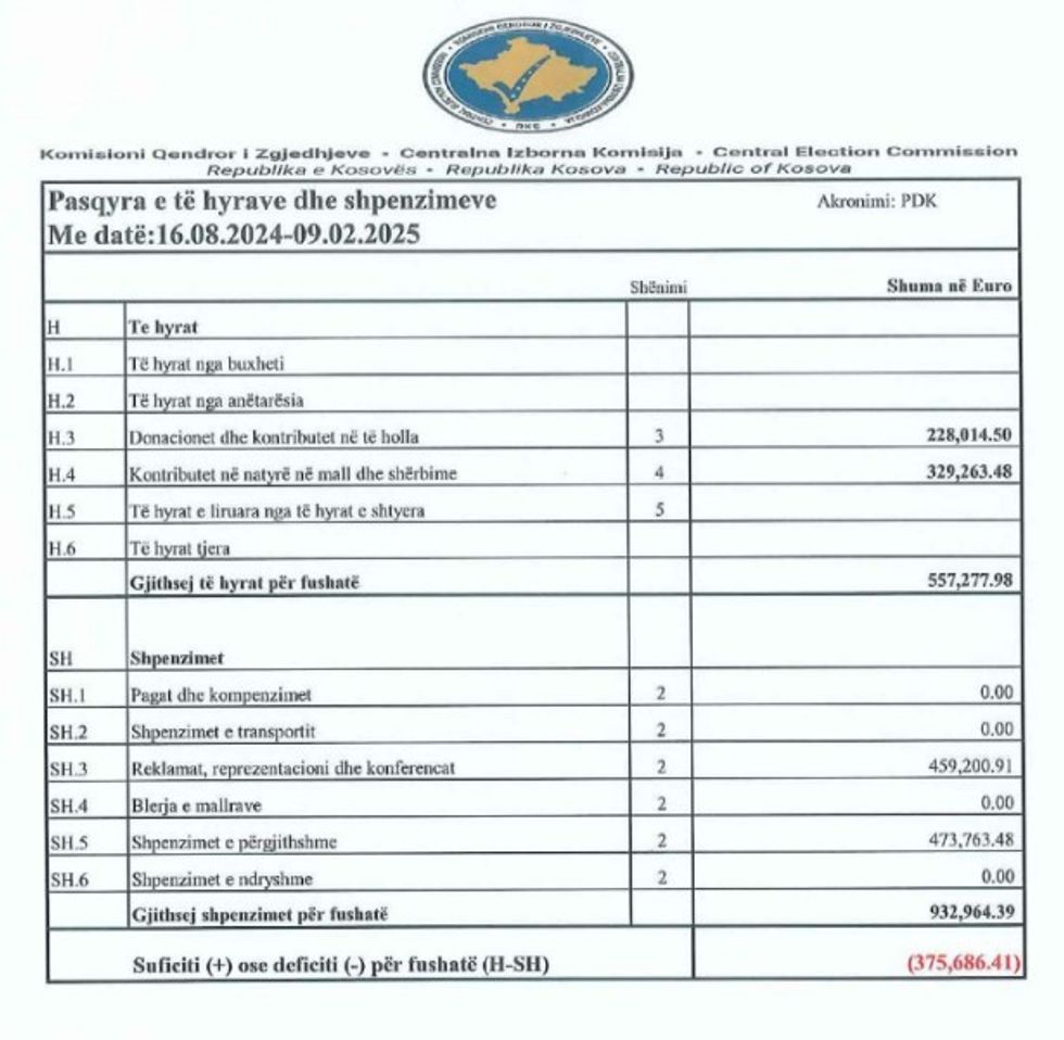Partia Demokratike e Kosovës (PDK) i ka deklaruar Komisionit Qendror të Zgjedhjeve (KQZ) se me 557 mijë e 277 euro ka hyrë në fushatën e saj politike në zgjedhjet parlamentare të datës 09.02.2025.