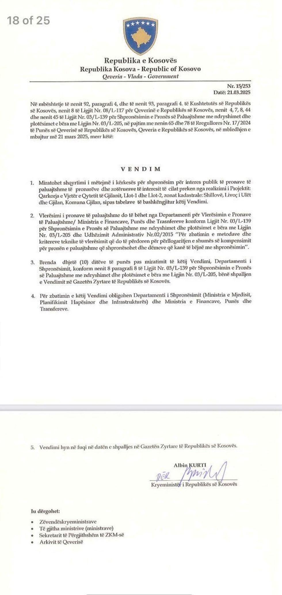 Bekim Salihu, drejtori për Kadastër, Gjeodezi dhe Pronë në Komunën e Gjilanit, shton se më datën 21.03.2025, në mbledhjen e Qeverisë së Republikës së Kosovës, me numër 15/2023, është miratuar vendimi për shqyrtimin e mëtejshëm të shpronësimit të parcelave që preken nga projekti "Qarkorja e Vjetër".