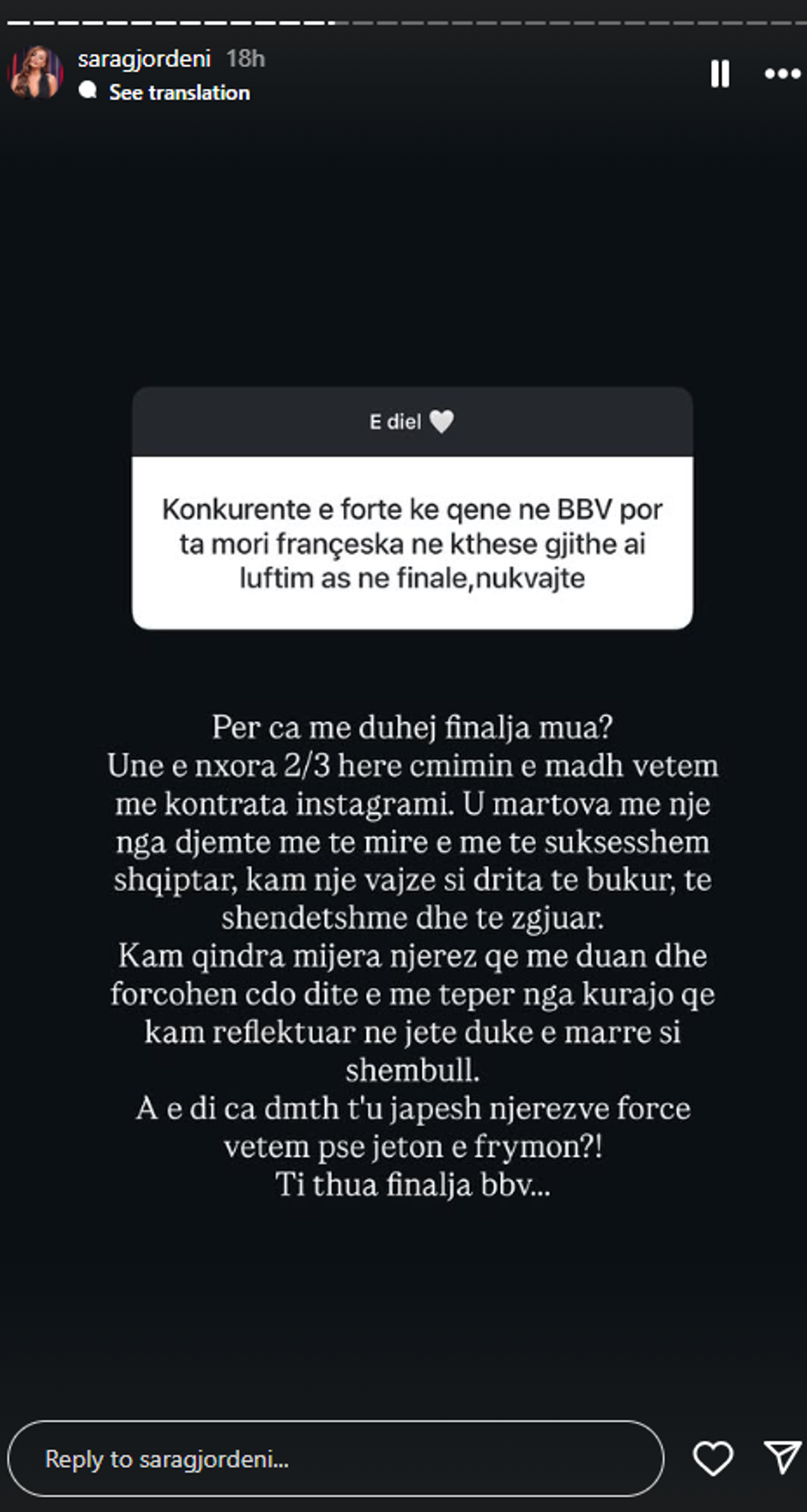 “Kam qindra mijëra njerëz që më duan dhe forcohen çdo ditë e më tepër nga kurajo që kam reflektuar në jetë duke e marrë si shembull... Ti thua finalja e BBV...”.