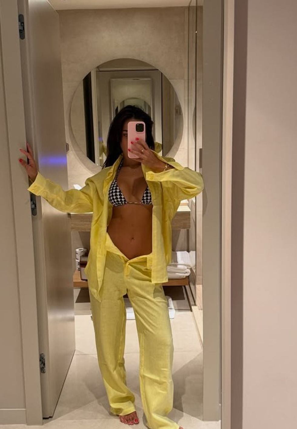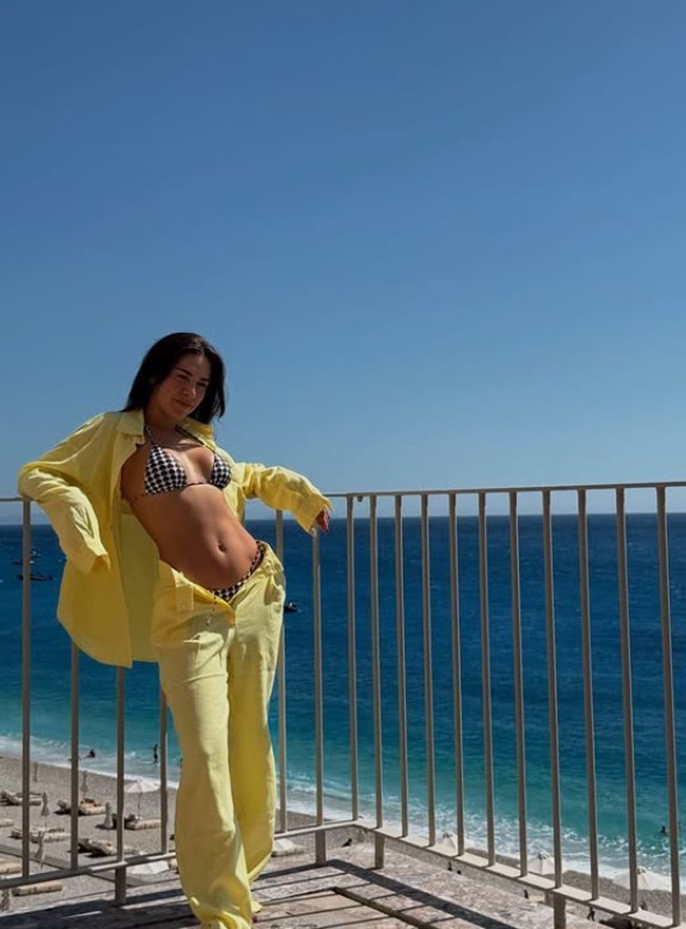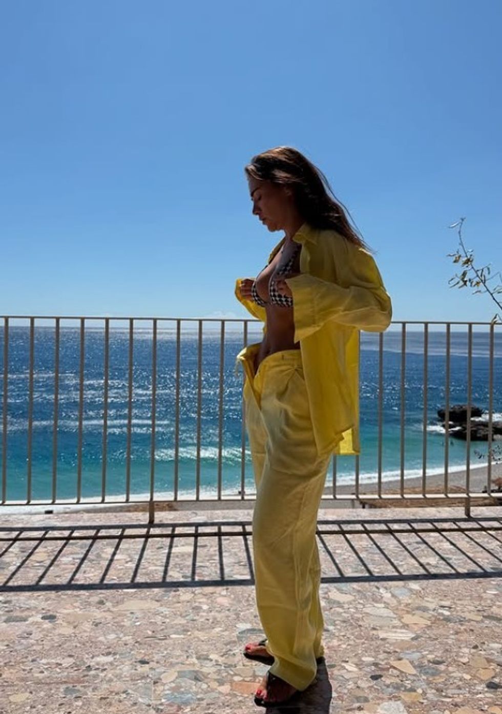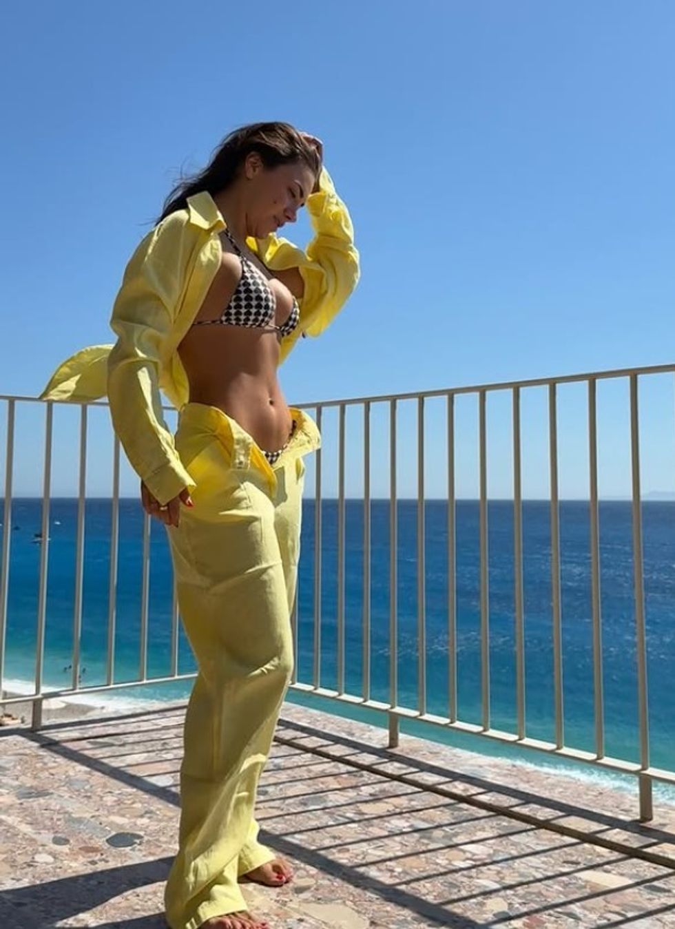 E veshur me një set në ngjyrë të verdhë të ndezur, të kombinuar me bikini bardhë e zi me print gjeometrik, ajo ka sjellë një atmosferë të gjallë verore dhe elegancë natyrale.